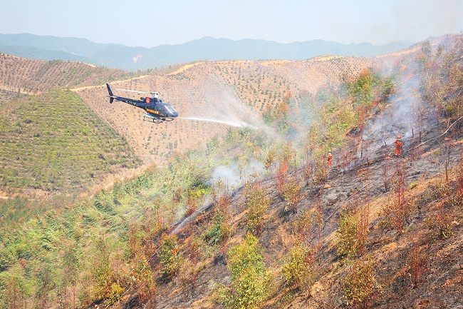 因风向突变火势扩大威胁周边民宅,现场指挥部组织有效力量疏散村民,采取前攻远供的方式,利用消防车车载水炮对威胁村庄安全的林木洒水保护,扑灭靠近村庄的树木火,并组织远距离供水保障。此次演练还采用直升机射水对火势进行压制,对被困者进行转运。