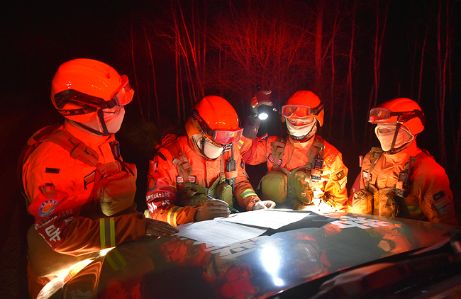 夜间“行军”是对消防救援人员驾驶技术和指挥能力的综合考验和验收,为保证此次行动的安全顺利,大队利用地形图、GPS和无人机侦察选择开进路线,而后按照摩托化机动、途中车辆故障排除、转乘特种车向火场开进、徒步接近火线的顺序展开。