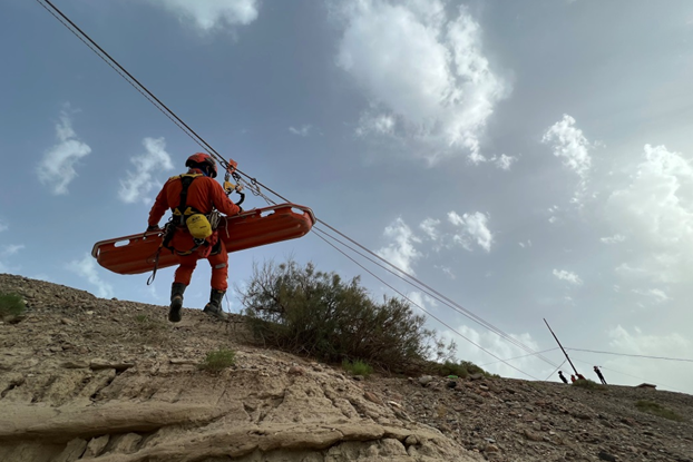 在50米高空、60度陡坡上,消防救援人员使用抛投器将牵引绳精准抛投至相距100米外的山脊上,而后使用钢钎制作锚点,在两处山脊之间架设绳索通道。经过安全检查后,消防员携带绳索、全身吊带、船型担架等安全防护装备和救援装备,通过绳索横渡到100米外的山脊之上实施“救援”。20余名全身武装的培训队员满头大汗,神情紧张,十来根粗壮的绳子或紧系腰间,或缠绕手中,紧紧地维系着一具担架,反复往返在山脊之间。