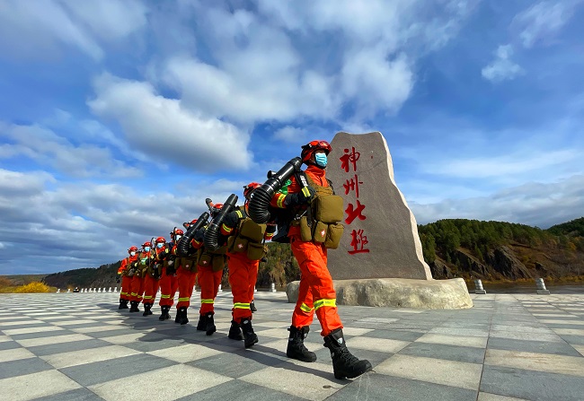 “绿水青山是我家,森林防火靠大家。”在北极广场一角,红黄相间的防火条幅显得格外醒目,分队长郑伟和队员们正忙碌着向游客们展示各类灭火装备。这里是北极村景区核心区,不少游客都会来这里游玩留念。