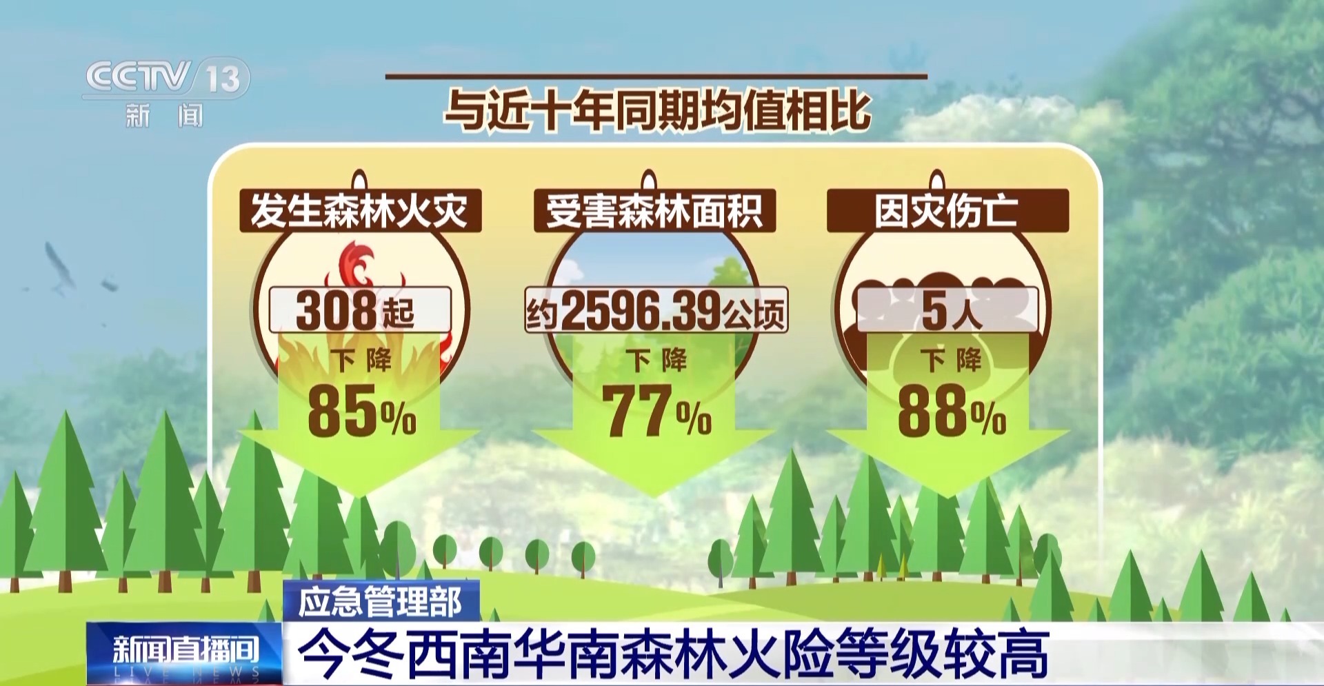 应急管理部国家自然灾害防治研究院 姚启超:我们今冬隐患主要有三个方面,第一是全球变暖之后造成了极端天气的频发。第二点是原始林区的可燃物载量的持续增多。第三是人为活动的增加和增大。今年火灾风险隐患较多的地方就是我国西南地区和我国的华南地区,而这些地区也正是受极端天气影响较多的地区。当这些地区出现高温,或者是耦合着干旱,叠加大风天气的时候,极易爆发森林火灾。