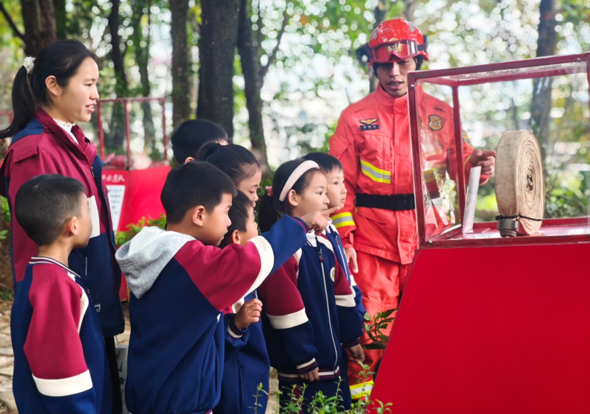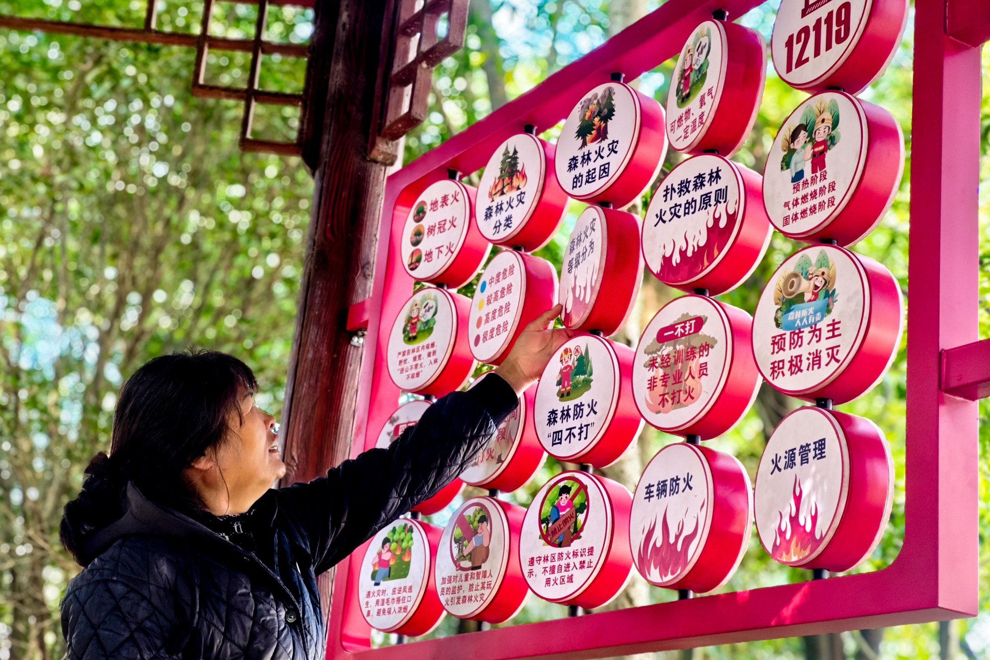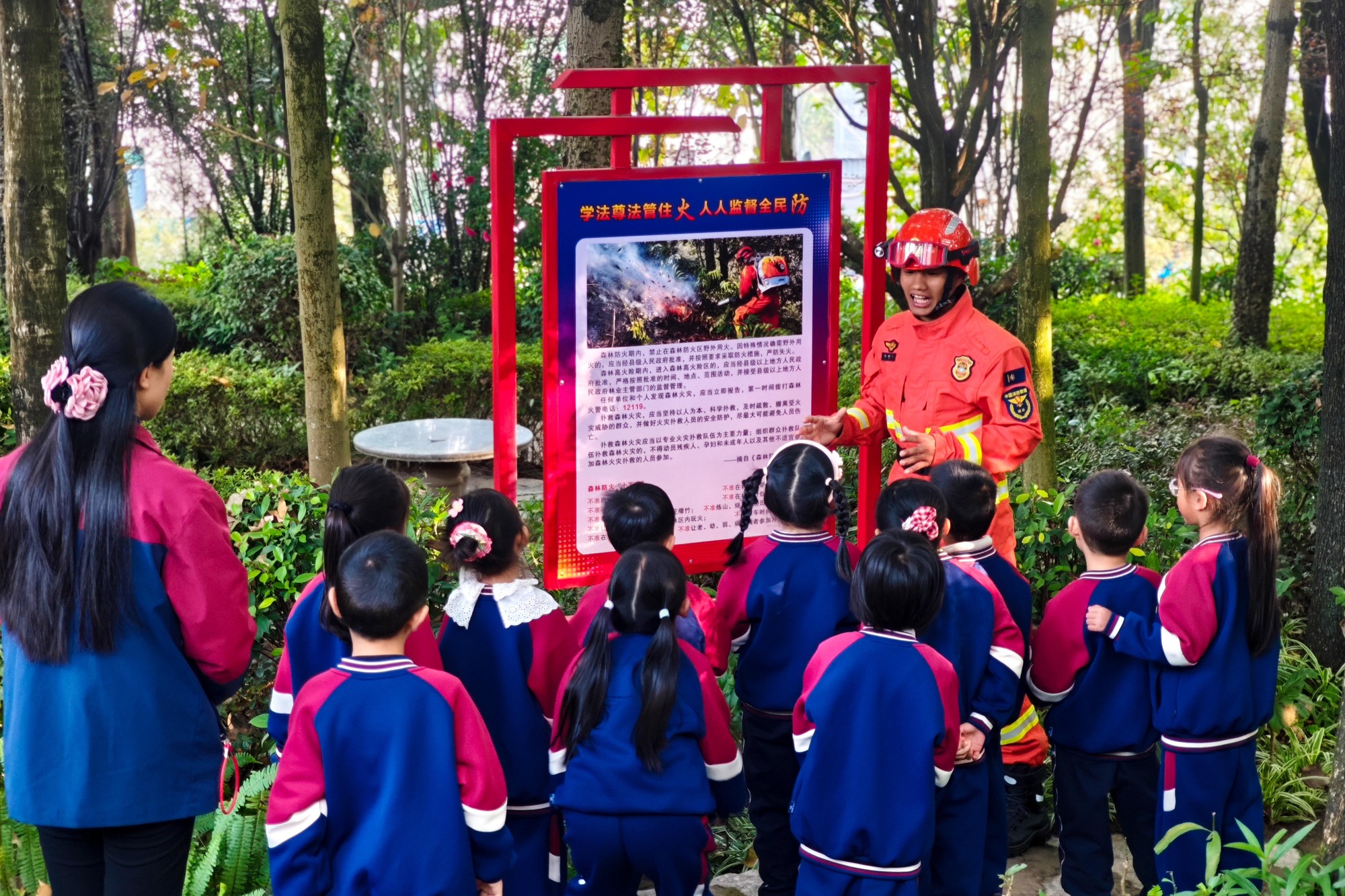 该主题公园坐落于景东彝族自治县锦屏镇大草地社区凉水井,占地672平方米,在保留原有自然风貌基础上,巧妙植入多元科普元素。园内6个主题宣传栏,系统呈现“两山”生态价值、火灾成因及12119报警常识;4个实物展柜,直观陈列森林防火常用装备;两座凉亭通过灭火版画、宣传画与互动游戏传递消防知识。景东华卓幼儿园老师刘芹说:“带小朋友参观后,书本上抽象的不能玩火道理,变成孩子们看得见、摸得着的实物展示,小朋友们潜移默化掌握了安全常识。”
