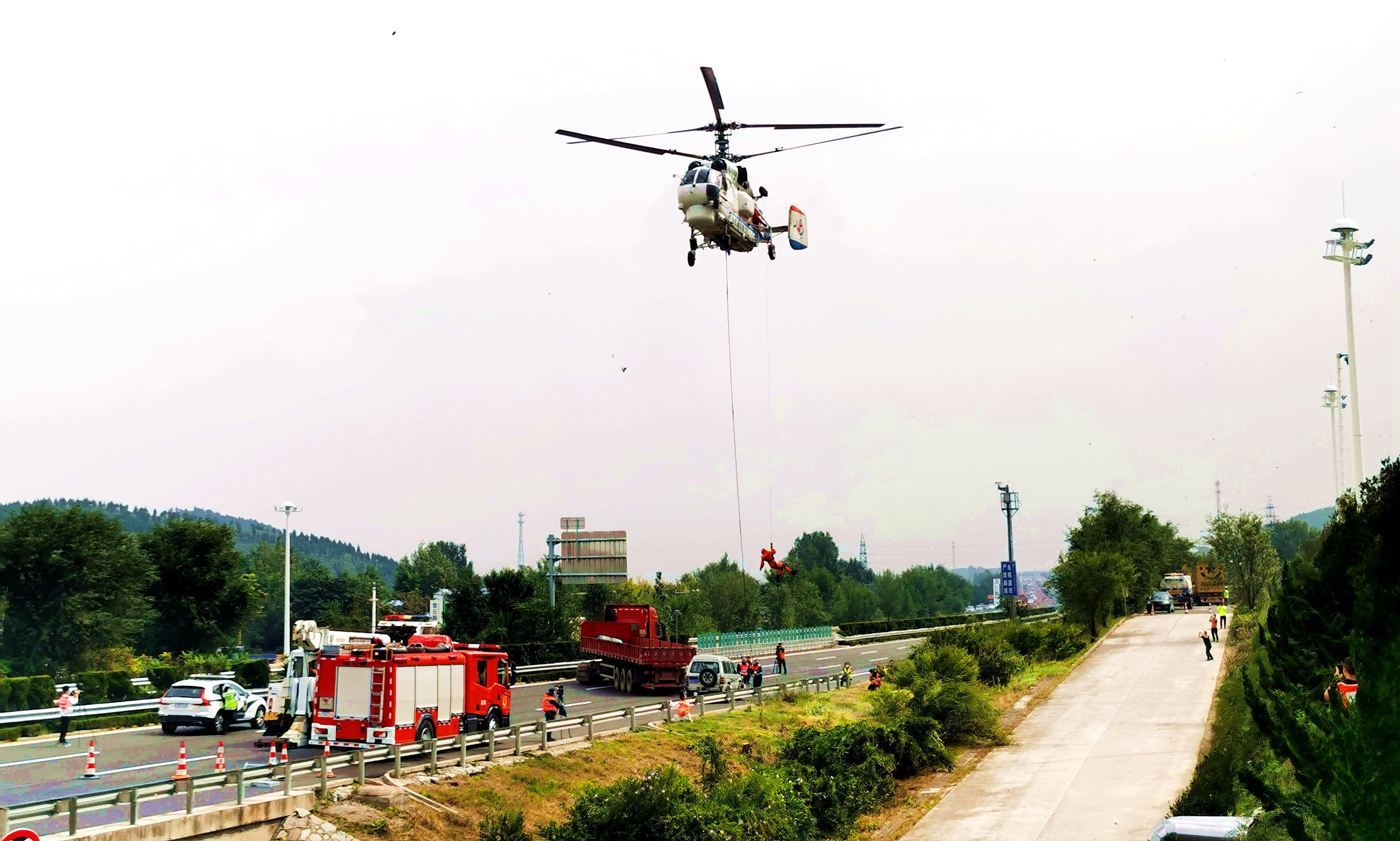 9月17日,山东高速公路救援清障地空联合救援演练在京沪高速济莱段举行,山东省航空应急救援中心调派K-32和H135两架直升机参与演练。