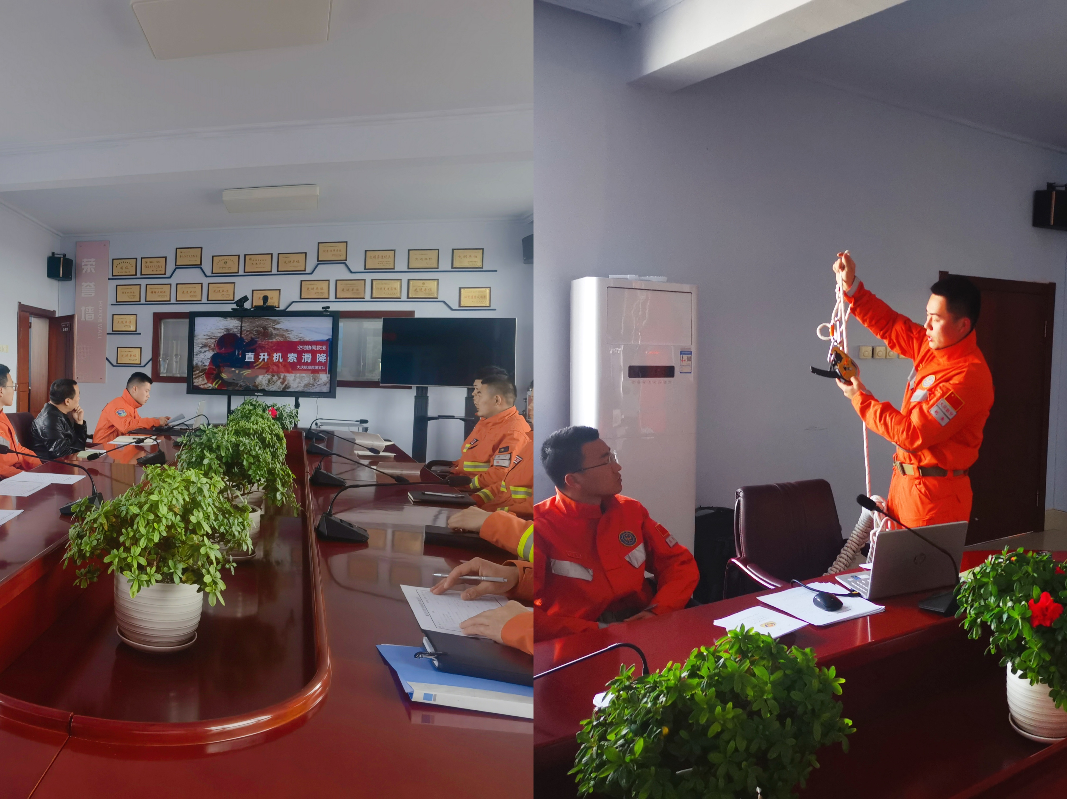 为顺利完成此次训练,站领导提前组织大庆支队驻防机组、嫩江大队主要负责同志召开空地协同训练任务部署会,围绕地面授课、训练安排、组训模式、相关保障等内容,研究和制定了联训实施方案和训练计划,共同商定联训事宜,明确组训思路及重点任务。支队特勤骨干围绕索滑降实施方法、装具穿戴、乘机安全注意事项等内容,从操作流程、动作要点进行详细的讲解示范,确保每名指战员理论知识掌握扎实,力求最大限度强化救援实战效能。