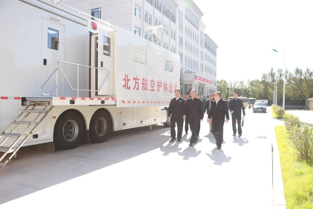 徐加爱参观了航空应急救援综合通信指挥车和应急通信装备,走进调度指挥中心了解应急值守情况,听取航空调度、卫星监测、航空气象和航空管制业务工作介绍,并与正在黑龙江大兴安岭林区执行空中巡护任务的运-12林火预警机进行视频连线。