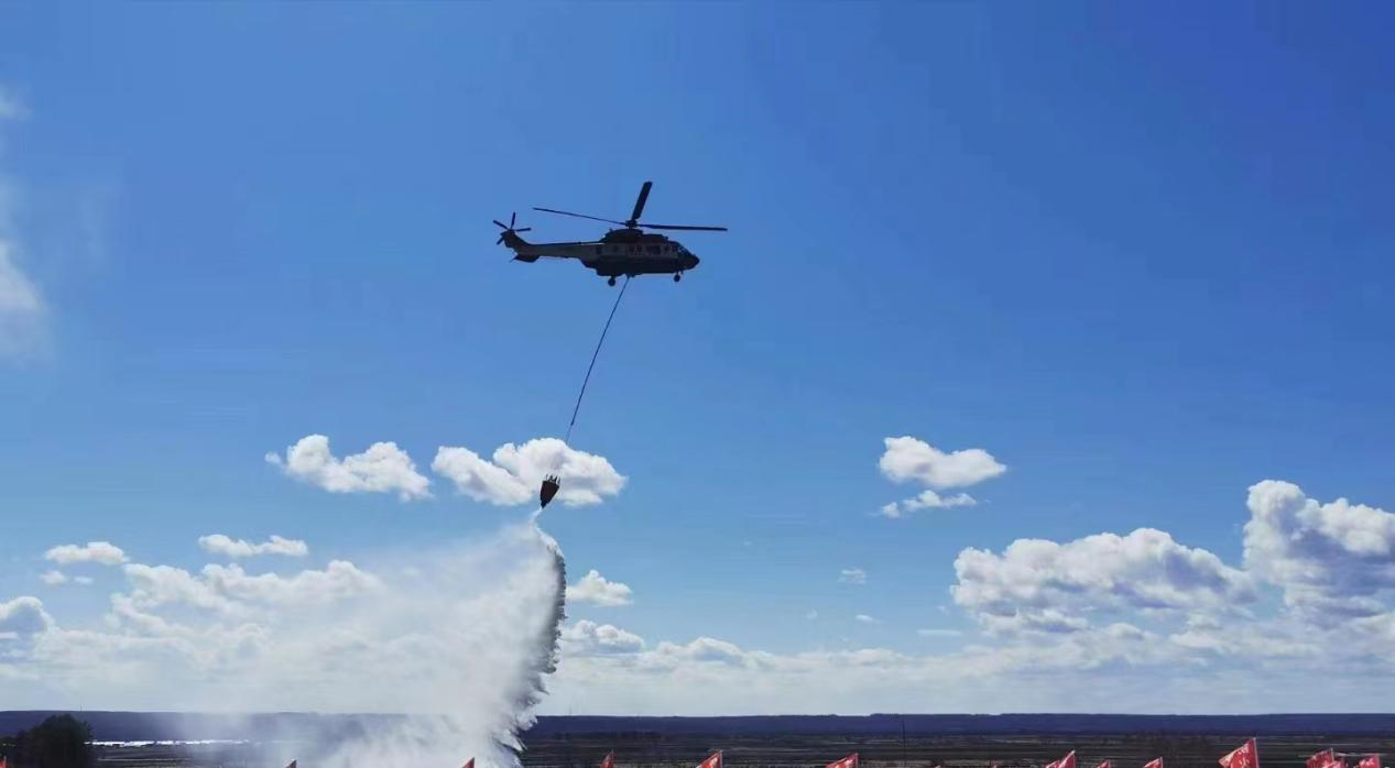 此次演练模拟南山瞭望塔发现火情,位置于孙吴镇南2.4公里处,火势由西向东快速蔓延并威胁孙吴镇南林区和人民群众生命财产安全。火情就是命令!演练现场的火险等级不断增加,指挥部迅速启动县森林草原火灾应急预案。接到命令后,黑河航站立即启动扑救火灾应急预案,派出AS332直升机带领专业扑火队员前往火场勘察火情,并迅速组织实施机降作业。同时,派出BELL-407直升机悬挂吊桶,飞赴火场开展洒水作业,按照预定位置准确实施洒水作业,有效遏制火势的蔓延。经过地面人员扑救和空中洒水相配合,成功将火场明火全部扑灭!