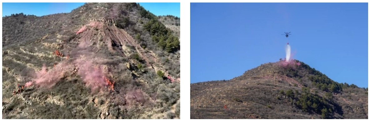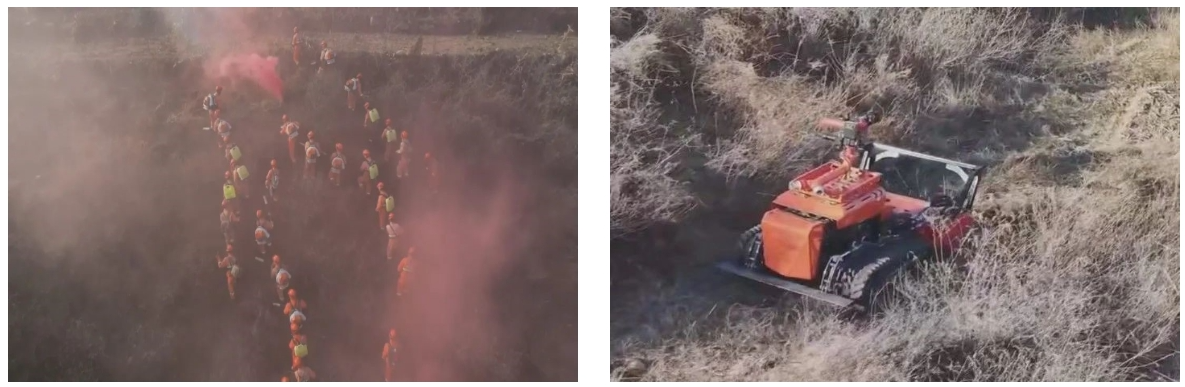 演练区域分为“东+西+南”三条火线,东线采取“两翼对进、钳形夹击”战法,实施以高扬程、大功率抽水泵、接力水泵串并联的以水灭火作业;西线采取“一点突破、两线推进”战法,实施以风力、细水雾灭火机、割灌机、油锯、二号工具组合的机械灭火作业;南线采取“全线封控、预设隔离、空中作业”战法,调用挖掘机、遥控灭火机器人等开辟隔离带作业封锁火线后,实施以直升机吊桶洒水、无人机投弹的航空灭火作业;同时,实施无人机火场实时侦查,气象作业车持续监测风力风向,通信电力保障车做好通讯供电保障等,通过多种技战术融合运用,火灾扑救行动有序开展,各部门、队伍明确分工,紧密协作,火场顺利实现合围。