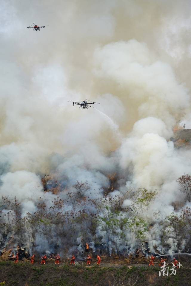 与此同时,无人机群也投入灭火战斗。全自动一体化无人机系统迅速启动,巡查无人机进行先行火情侦察,灭火无人机根据性能特点迅速组成“空中编队”,载弹和吊桶无人机进行压制火头,形成扑救森林火灾的“立体防线”。