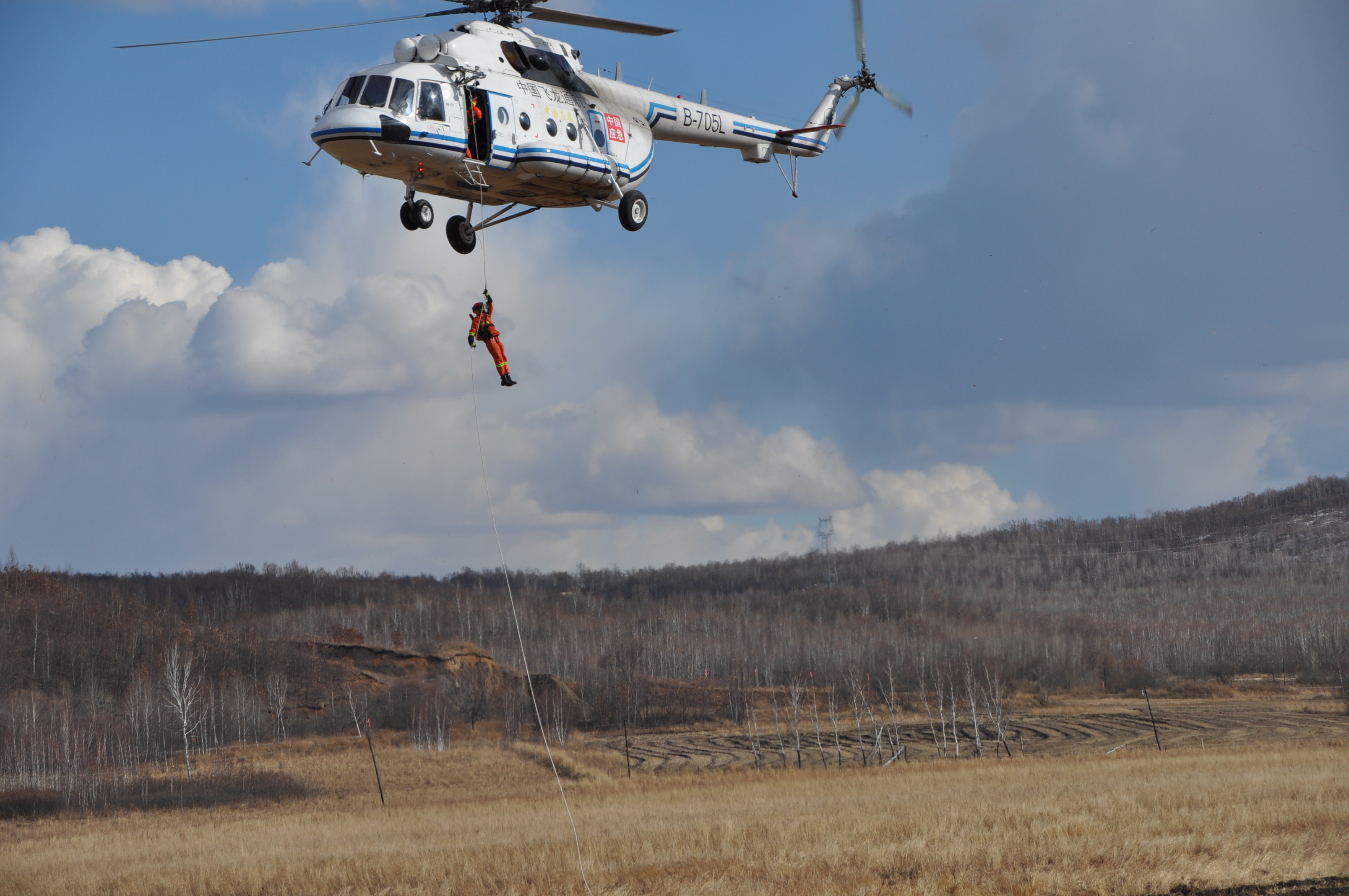 演练开始,索降队员在直升机地勤人员指引下快速登机,接到起飞命令后,M-171直升机飞赴“火场”实施灭火救援。同时,地面扑火队员迅速乘车奔赴“火场”,到达“火场”后,飞行观察员依据气候条件和“火场”形势选择合适的索降地点,按要求完成演练内容。