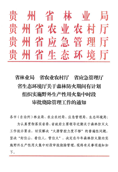 为切实解决“火源管控力度不够”的普遍性问题,坚决“封住山、看住人、管住火”,11月29日,贵州省林业局、贵州省农业农村厅、贵州省应急管理厅、贵州省生态环境厅联合发文,2024—2025年度森林防火期内组织实施野外生产性用火集中时段审批烧除管理。
