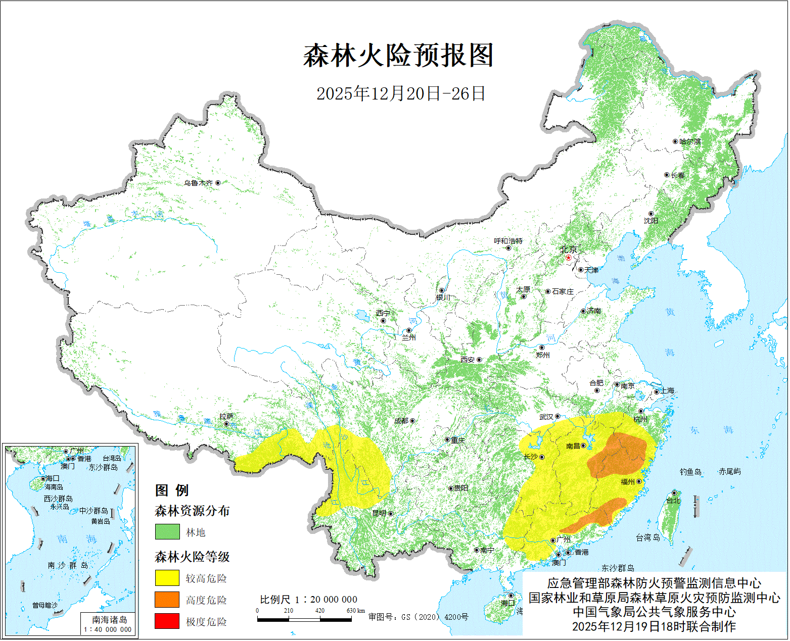 经综合研判,预计12月20日至26日,浙江西南部、福建北部和南部、江西东北部、广东东部的部分地区森林火险等级将维持高度危险级别,国家森林草原防灭火指挥部办公室特发布高森林火险橙色预警,请密切关注火险变化,落实预警响应措施,持续加强火源管控,强化应急准备,有效应对当前严峻的高森林火险形势。