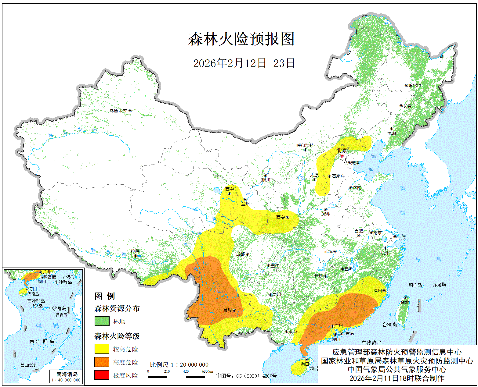 经综合研判,预计2026年2月12日至23日,福建南部、江西南部、广东大部、广西东部、四川南部、云南中北部、西藏东南部的局部地区森林火险等级将维持高度危险级别,特发布高森林火险橙色预警,请密切关注火险变化,落实预警响应措施,持续加强火源管控,强化应急准备,有效应对当前及春节期间严峻的高森林火险形势。