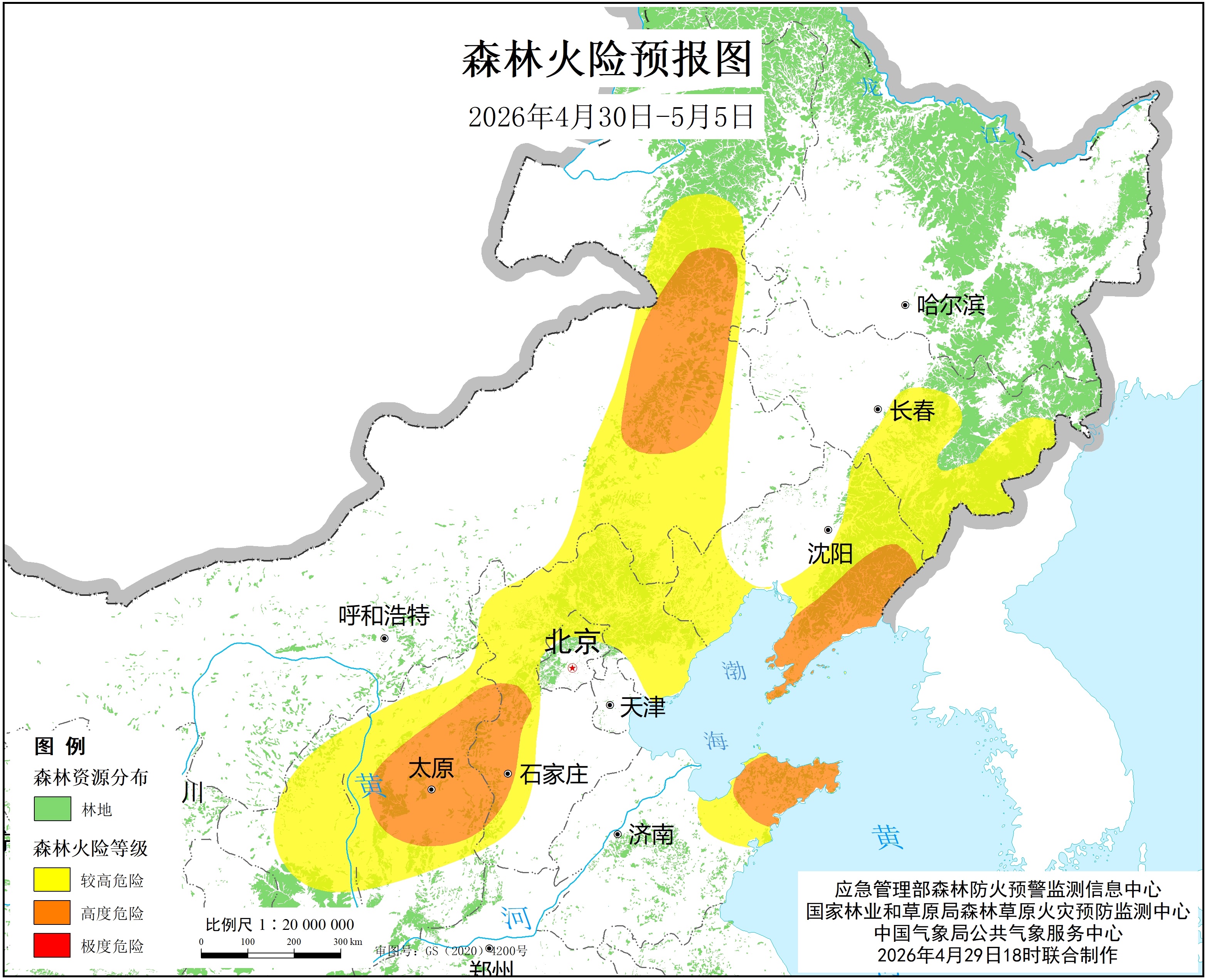 经综合研判,预计2026年4月30日至5月5日,河北西部、山西中部、内蒙古东部、辽宁东部、山东东部的部分地区森林火险等级将维持高度危险级别,特发布高森林火险橙色预警。请密切关注火险变化,落实预警响应措施,持续加强火源管控,强化应急准备,有效应对当前严峻的高森林火险形势。