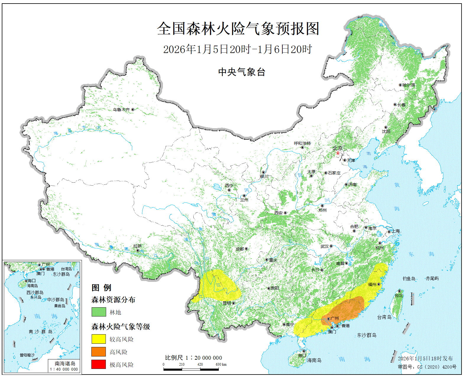 预计,今天晚上到明天白天,浙江南部、福建大部、江西南部、广东大部、广西东南部、四川西南部、云南北部的部分地区森林火险等级较高危险。其中,福建南部、江西东南部、广东东部和中部的局部地区森林火险等级为高度危险全国草原火险等级较低。