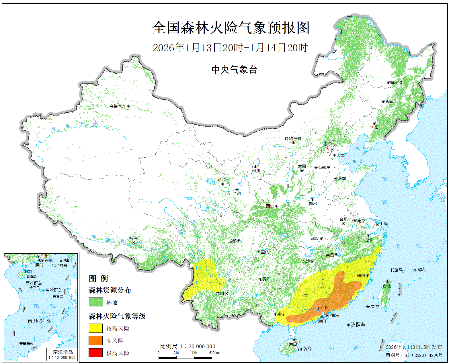 预计,今天晚上到明天白天,浙江南部、福建大部、江西南部、湖南南部、广东大部、广西东部、四川西南部、云南北部的部分地区森林火险等级为较高危险。其中,福建南部、江西东南部、广东东部和南部、广西东南部的局部地区森林火险等级为高度危险。全国草原火险等级较低。