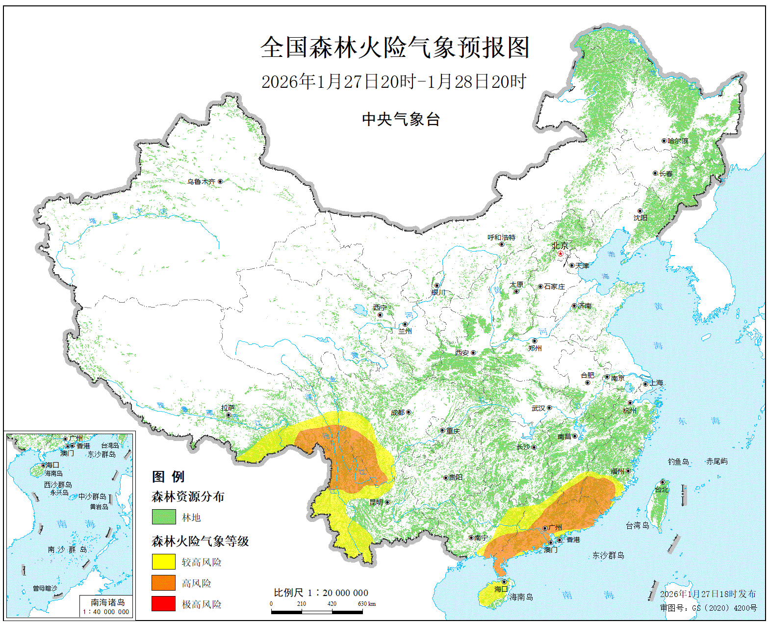 预计,今天晚上到明天白天,福建南部、江西南部、广东大部、广西东部、海南大部、四川西南部、云南西部和南部、西藏东南部的部分地区森林火险等级为较高危险。其中,福建南部、江西东南部、广东东部和南部、广西东南部、四川西南部、云南西北部、西藏东南部的局部地区森林火险等级为高度危险。全国草原火险等级较低。
