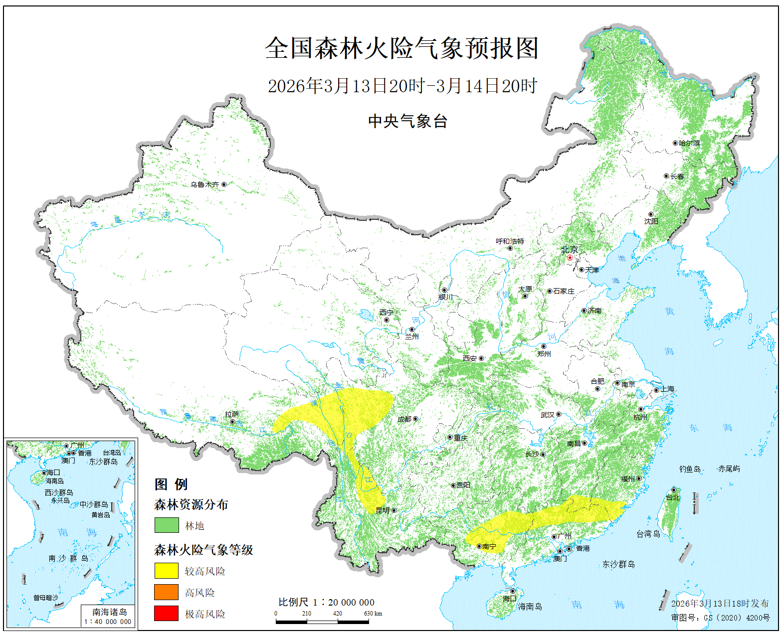 预计,今天晚上到明天白天,福建南部、江西南部、广东北部、广西中部和东部、四川西部、云南中北部、西藏东部的部分地区森林火险等级为较高危险。四川西部的部分地区草原火险等级为较高危险。