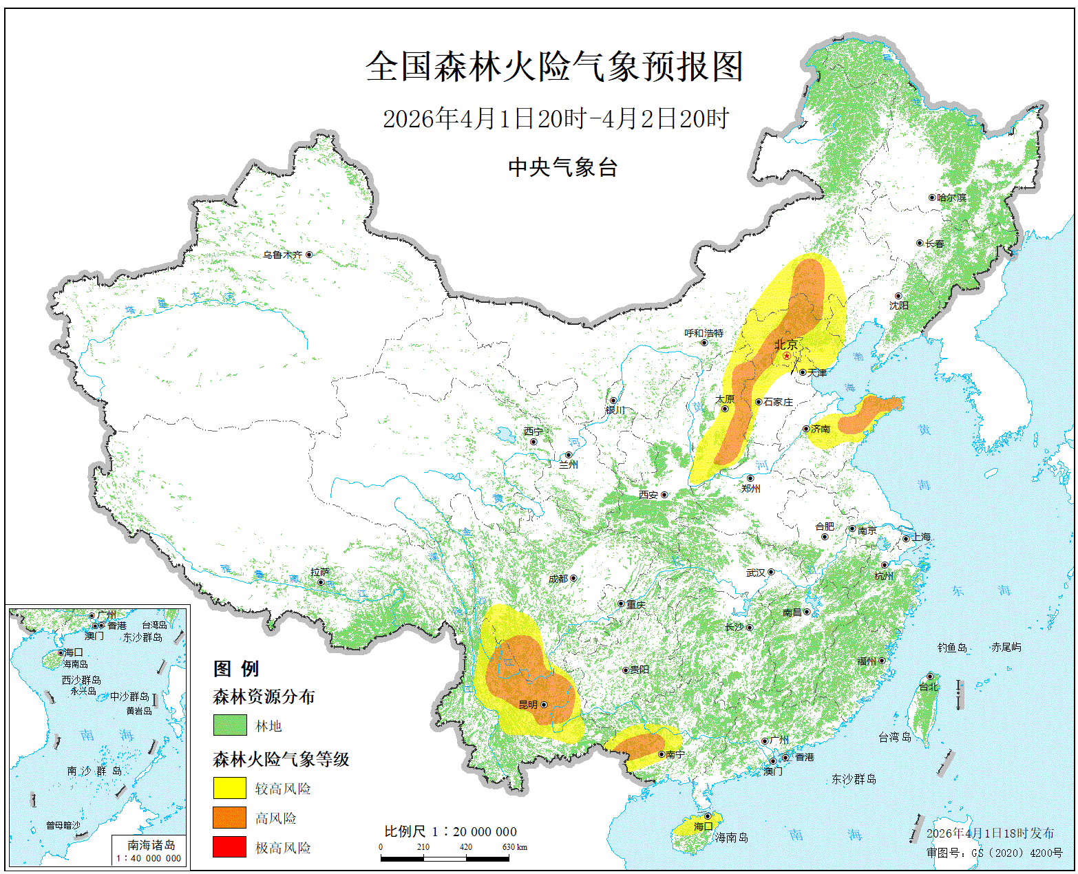 预计,今天晚上到明天白天,北京西部和北部、河北西部和北部、山西东部和南部、内蒙古东部、辽宁西部、山东中部和东部、广西中西部、海南北部、四川西部和南部、云南中北部的部分地区森林火险等级为较高危险。其中,北京西部和北部、河北西部和北部、山西东部和南部、内蒙古东部、山东东部、广西中西部、四川南部、云南中北部的局部地区森林火险等级为高度危险。内蒙古东部的部分地区草原火险等级为高度危险。
