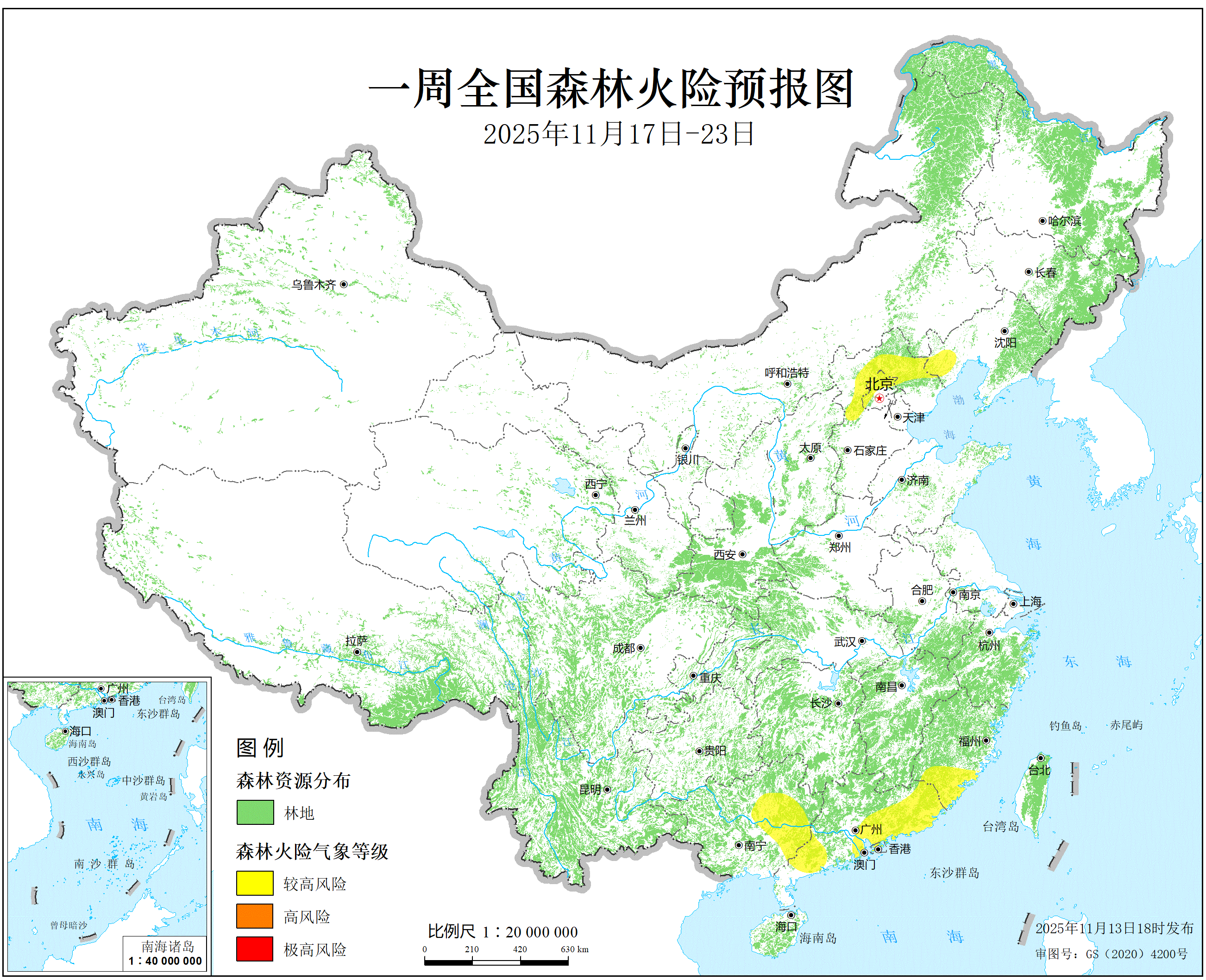 预计本周(11月17日至23日),北京北部、河北北部、辽宁西南部、福建南部、广东东南部和西部、广西中东部的部分地区森林火险等级为较高危险。全国草原火险等级较低。