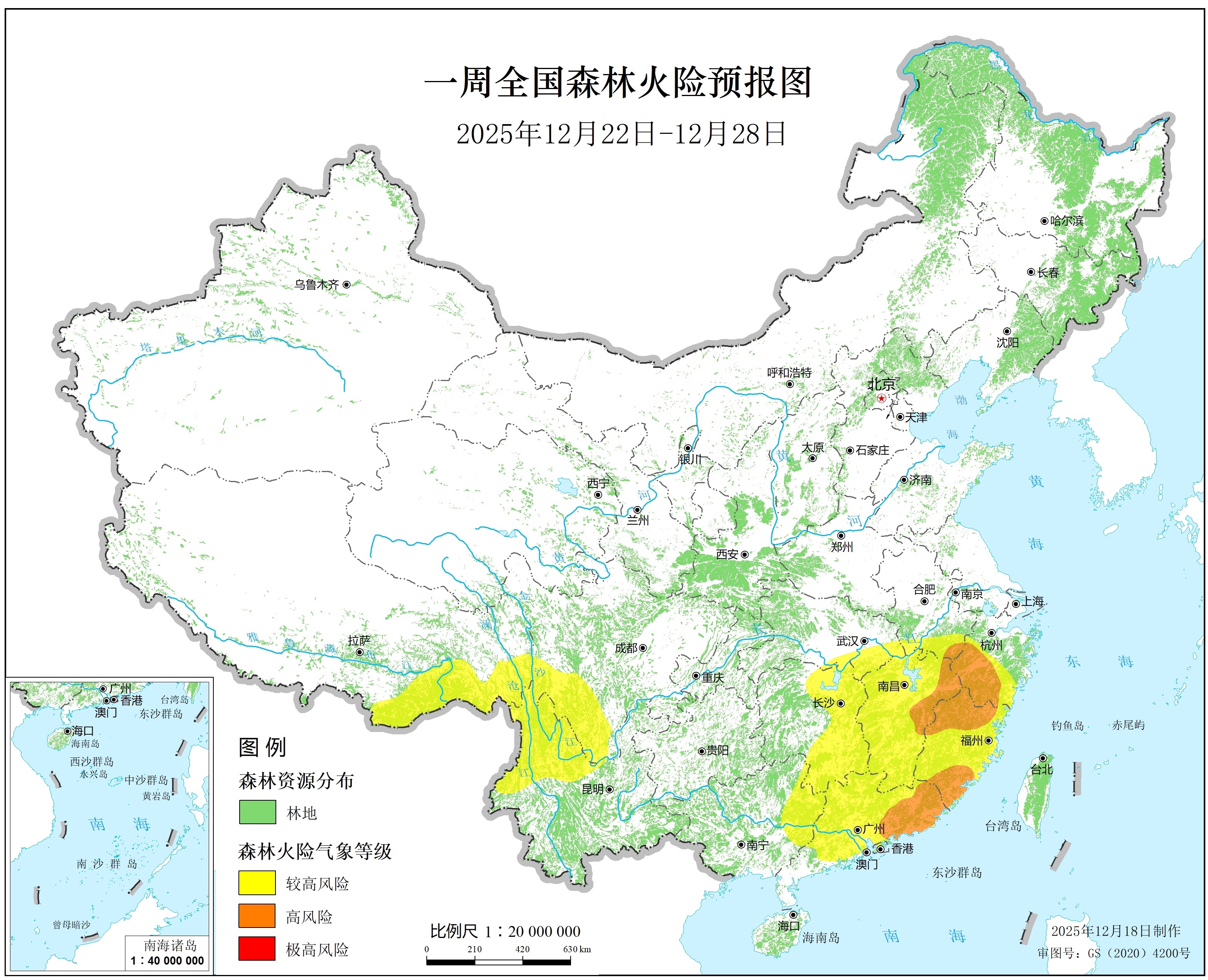 预计本周(12月22日—28日),浙江西部、安徽南部、福建大部、江西大部、湖北东南部、湖南东部、广东大部、广西东部、四川西南部、云南西北部、西藏东南部的部分地区森林火险等级为较高危险,其中,浙江西南部(金华、衢州、丽水)、安徽南部(黄山)、福建北部和东南部(泉州、漳州、龙岩、三明、南平、宁德)、江西东北部(上饶、抚州、鹰潭)、广东东部(惠州、梅州、汕尾、河源、潮州、揭阳)的局部地区森林火险等级为高度危险。全国草原火险等级较低。