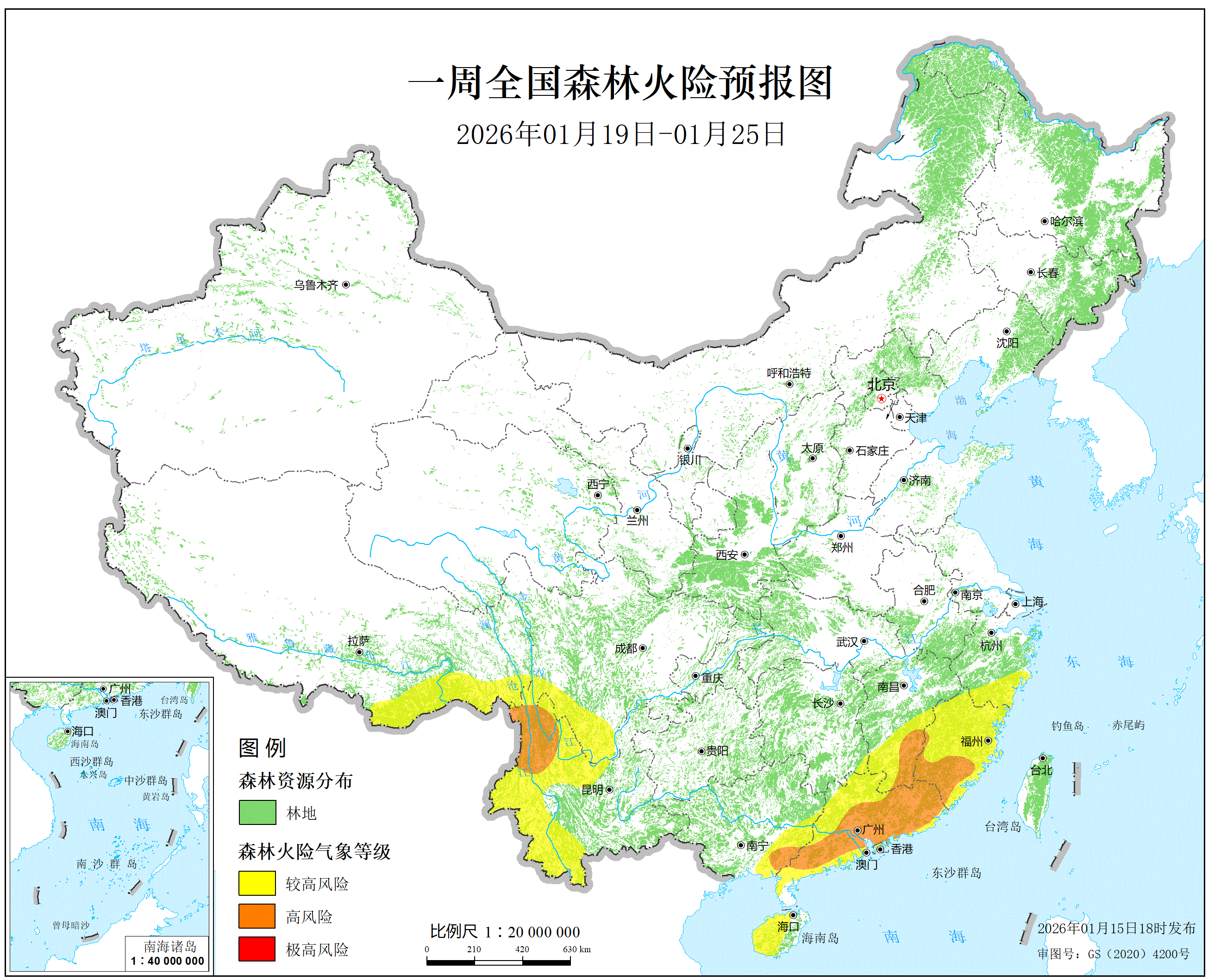 预计本周(1月19日—25日),浙江南部、福建大部、江西南部、湖南东南部、广东大部、广西东南部、海南西部、四川西南部、云南西部和南部、西藏东南部的部分地区森林火险等级为较高危险,其中,福建南部(泉州、龙岩)、江西东南部(赣州)、广东东部和南部(广州、深圳、珠海、汕头、茂名、惠州、梅州、汕尾、河源、清远、潮州、揭阳、云浮)、广西东南部玉林、云南西北部怒江、迪庆的局部地区森林火险等级为高度危险。全国草原火险等级较低。