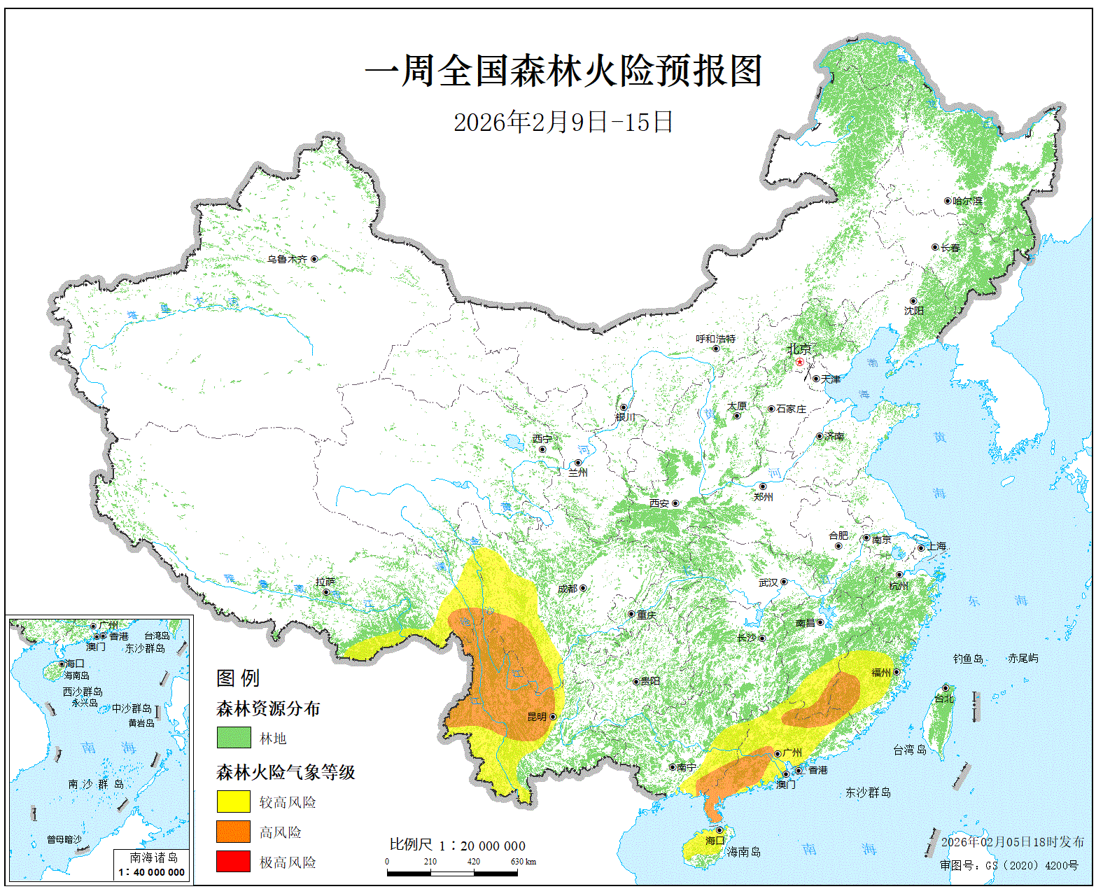 预计本周(2026年2月9日—15日),福建中南部、江西南部、广东大部、广西东部、海南大部、四川西部和南部、云南中西部、西藏东部的部分地区森林火险等级为较高危险,其中,福建西南部(龙岩、三明)、江西东南部(赣州)、广东西南部和北部(佛山、韶关、湛江、肇庆、江门、茂名、梅州、河源、阳江、云浮)、广西东南部(北海、玉林)、四川西南部(攀枝花、甘孜、凉山)、云南中部和西北部(昆明、楚雄、玉溪、普洱、大理、保山、德宏、丽江、怒江、迪庆、临沧)、西藏东南部(昌都、林芝)的局部地区森林火险等级为高度危险。全国草原火险等级较低。