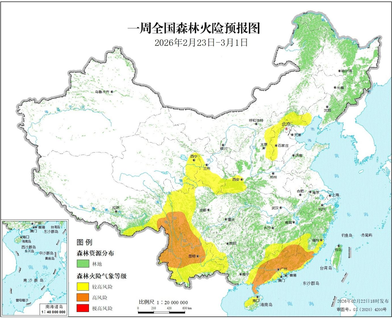 预计本周(2月23日—3月1日),北京北部、河北北部和西部、山西东部、辽宁西部、福建南部、江西南部、湖南南部、广东大部、广西东部和西部、海南西部、四川西部和南部、贵州西部、云南大部、西藏东部、陕西南部、甘肃南部、青海东部的部分地区森林火险等级为较高危险,其中,福建南部(厦门、漳州、龙岩)、江西南部(赣州)、广东大部(广州、佛山、韶关、湛江、肇庆、江门、茂名、惠州、梅州、汕尾、河源、阳江、清远、潮州、揭阳、云浮)、广西东部(梧州、贺州、玉林)、四川南部(攀枝花、甘孜、凉山)、云南中北部(昆明、楚雄、玉溪、普洱、大理、保山、德宏、丽江、怒江、迪庆、临沧)、西藏东南部(昌都、林芝)的局部地区森林火险等级为高度危险。25日起,受降雨影响,福建南部、江西南部、湖南南部、广东大部、广西东部的部分地区森林火险等级将有所降低;26日起,受雨雪天气影响,北京、河北、山西、陕西、甘肃、青海的部分地区森林火险等级将有所降低。四川西部、青海东部的部分地区草原火险等级为较高危险。