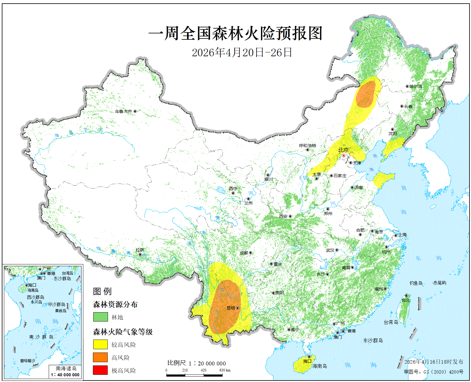 预计本周(4月20日—26日),河北西部和北部、山西北部、内蒙古东部、辽宁东南部、山东东部、海南大部、四川西部和南部、云南大部的部分地区森林火险等级为较高危险,其中,内蒙古东部(赤峰、兴安盟、通辽、锡林郭勒盟)、四川南部(攀枝花、凉山)、云南大部(昆明、楚雄、玉溪、普洱、西双版纳、大理、丽江、临沧)的局部地区森林火险等级为高度危险。内蒙古东部的部分地区草原火险等级为高度危险。