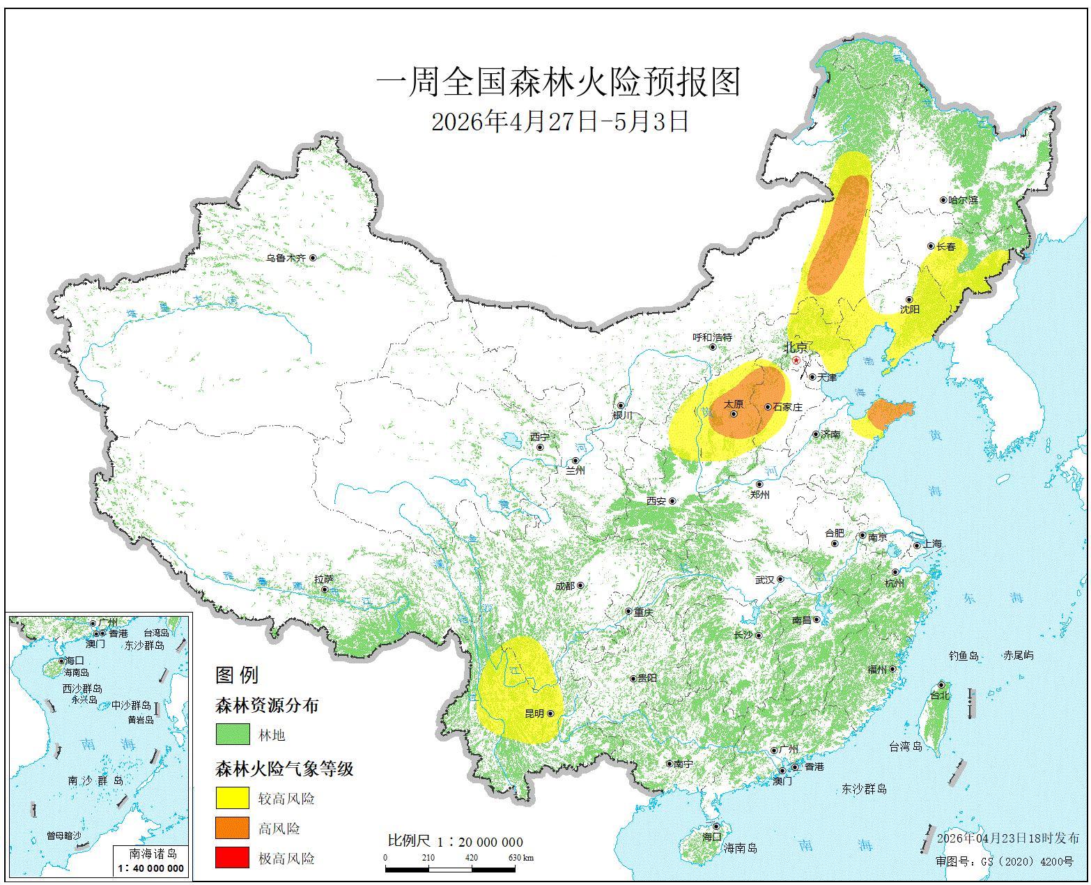 预计本周(4月27日—5月3日),北京北部、河北西部和东北部、山西中部和北部、内蒙古东部、辽宁东部和西南部、吉林中部和东部、山东东部、四川南部、云南中部和北部、陕西北部的部分地区森林火险等级为较高危险,其中,河北西部(石家庄、邯郸、邢台、保定、张家口)、山西中部(太原、大同、阳泉、长治、朔州、忻州、吕梁、晋中)、内蒙古东部(赤峰、呼伦贝尔、兴安盟、通辽、锡林郭勒盟)、山东东部(青岛、烟台、威海)的局部地区森林火险等级为高度危险。内蒙古东部的部分地区草原火险等级为高度危险